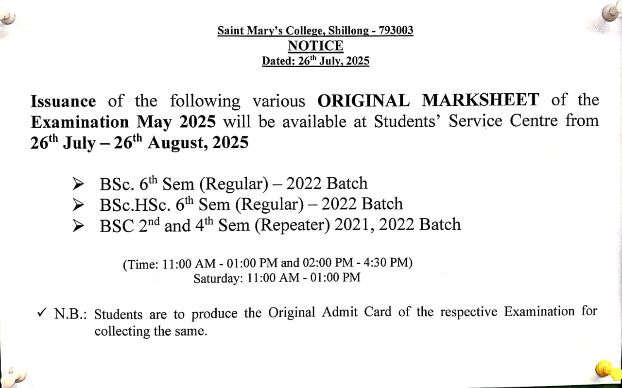 - Issuance of Original Marksheet of the Examination May 2025 - 01 Aug 2025