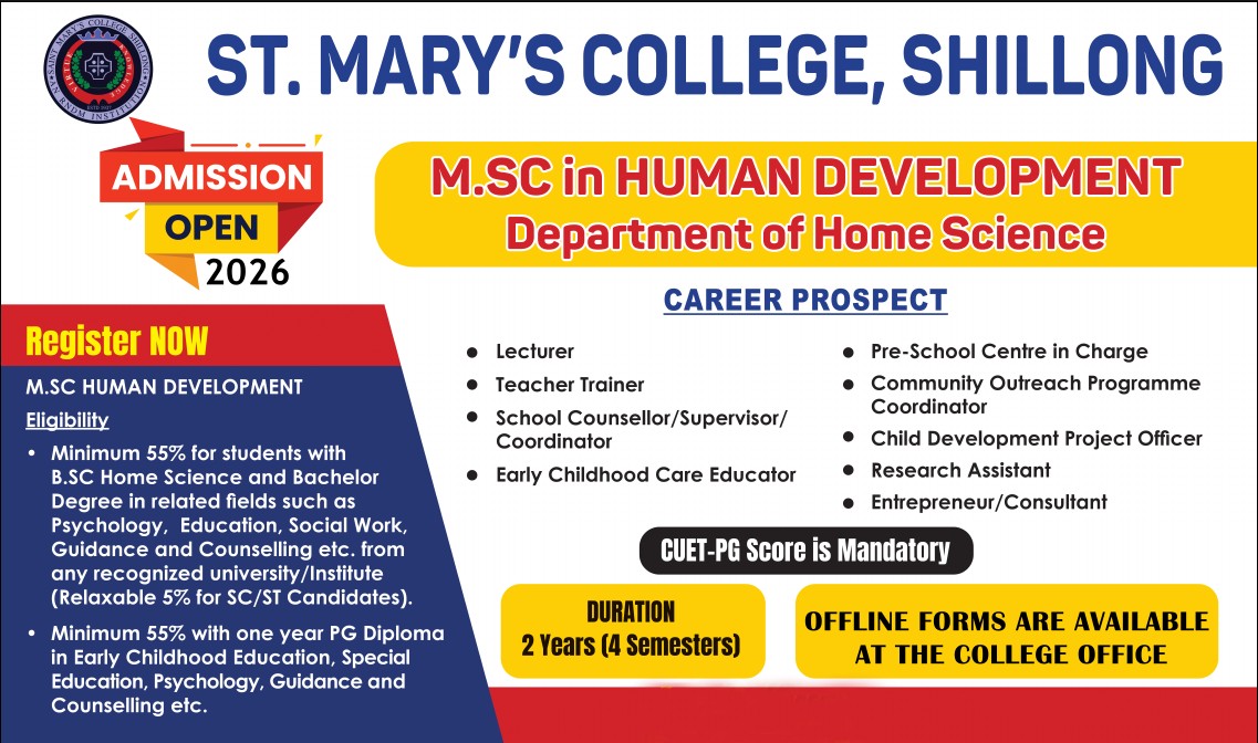 Entrance test for NON-CUET applicant will be held on 10th July 2026 at St. Mary's Collge, Shillong.